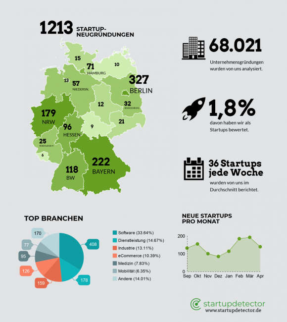 Seit September 2018 beobachtet startupdetector, welche Startups in Deutschland neu gegründet werden. In dieser Zeit haben wir insgesamt etwa 68.000 Neugründungen untersucht und darunter etwas über 1.200 Startups ausgemacht – das sind pro Monat im Durchschnitt über 150 neue Startups. Die meisten digitalen Unternehmen werden tatsächlich in Berlin gegründet, gefolgt von Bayern und Nordrhein-Westfalen. Rund ein Drittel der Startups entwickelt Software ohne besonderen Branchenfokus. Startups aus dem Bereich Dienstleistungen (15%) und Industrie (13%) sowie eCommerce (10%) und Medizin (8%) folgen.