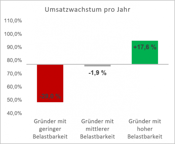 Gründerinnen und Gründer mit einer hoch ausgeprägten Belastbarkeit (hohe Stressresistenz und (innere) Ausgeglichenheit) erfüllen ihre Ziele ganze 15 Prozentpunkte besser als nicht belastbare Gründer/innen. Umgerechnet auf ein individuell oder investorenseitig gesetztes Umsatzziel von z.B. 2 Millionen Euro entspräche diese Persönlichkeitsausprägung somit einem unmittelbaren Impact von 300.000 Euro.