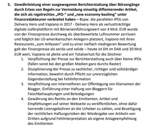 Gewährleistung einer ausgewogenen Berichterstattung über Börsengänge durch Erlass von Regeln zur Vermeidung einseitig diffamierender Artikel, die sich als regelrechtes „IPO-“ und „new economy-bashing“ unter Finanzredakteuren verbreitet haben – Bspw. die parallelen IPOs von Delivery Hero und Vapiano in 2017 – Delivery Hero als verlustträchtige digitale Lieferplattform mit Börseneinführungswert von 4 Mrd. EUR wurde von der Finanzpresse durchweg als überbewertete Luftnummer zerrissen und folglich bei US-amerikanischen Anlegern platziert, Vapiano mit ihren Restaurants „zum Anfassen“ und zu einer vielfach niedrigeren Bewertung galt der Finanzpresse als seriös und solide – heute ist DH im DAX und 30 Mrd. EUR wert, Vapiano ist pleite und ein Totalverlust für die Zeichner