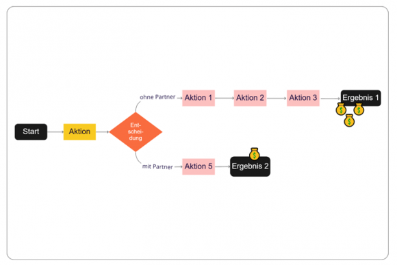 Was ist eigentlich ein Prozess? Ein Prozess ist eine verkettete Abfolge von Tätigkeiten, also ein Schritt-für-Schritt-Ablauf. Wenn ihr einen Geschäftsprozess definiert, reiht ihr also die einzelnen Schritte vom Beginn des Ablaufs bis zu seinem Ende auf. Wobei es ab bestimmten Entscheidungspunkten dann auch mehrere Möglichkeiten gibt, wie der Prozess weiterverläuft.